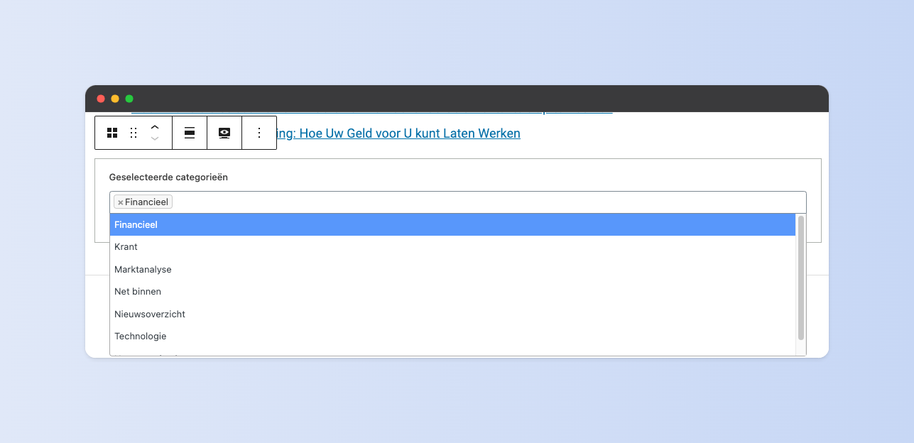 Bij toevoegen wordt een zoekvak weergegeven waarin een of meerdere categorieën geselecteerd kunnen worden. Zoek op een categorienaam om de lijst van suggesties te verfijnen. Klik op een item in de lijst om de categorie toe te voegen aan het blok.