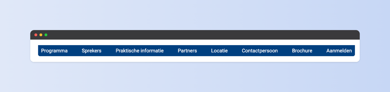Het menu wordt over de volle pagina-breedte getoond. Standaard bevat het menu de de aanwezige Evenement blokken in het bericht, tezamen met de opgegeven links.
