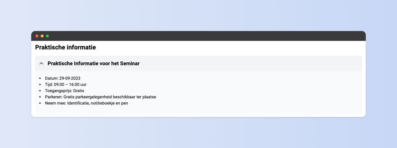 Je kunt het “Evenement - Praktische Informatie”-blok gebruiken voor het weergeven van een reeks uitklapbare blokken, voor bijvoorbeeld het weergeven van praktische informatie over een evenement. Het blok wordt automatisch opgenomen in het menu.