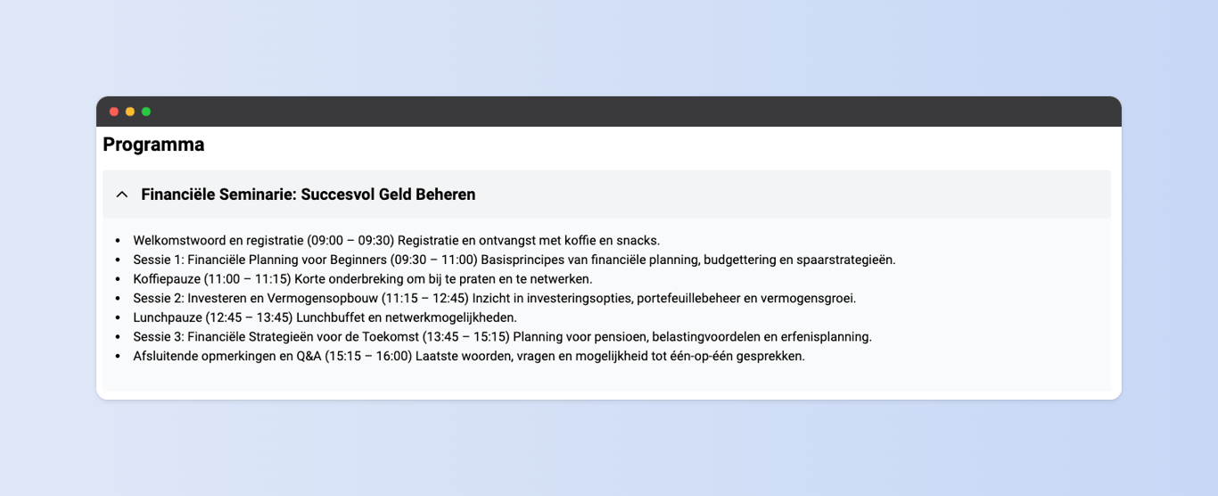 Je kunt het “Evenement - Programma”-blok gebruiken voor het weergeven van het programma van het evenement. Het blok wordt automatisch opgenomen in het menu.