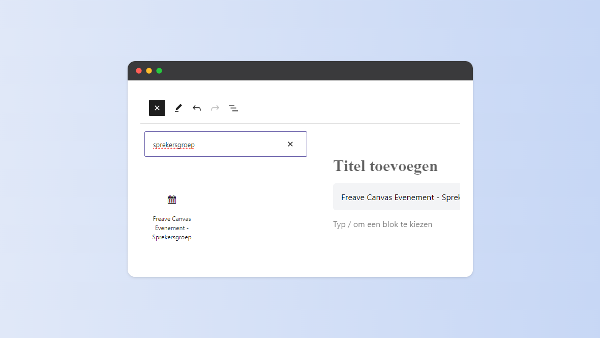 - Klik “Freave Canvas Evenement - Sprekersgroep” aan. Het wordt nu toegevoegd aan de pagina of het bericht. De voorbeeldweergave verschijnt in je scherm.