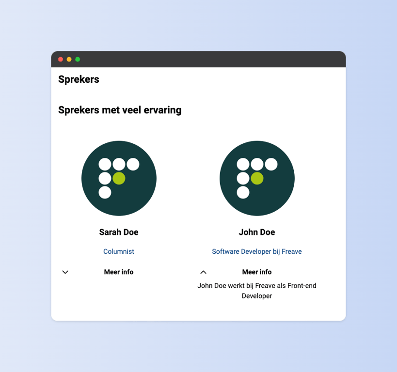 Een sprekersgroep wordt weergegeven als een lijst foto's met naam en functie. Als je op een spreker klikt wordt de opgegeven link geopend.