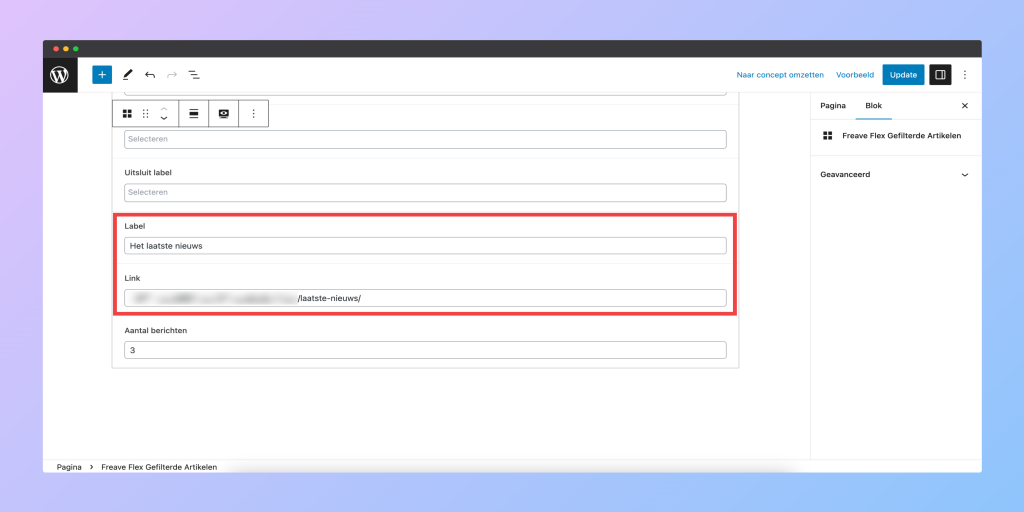 Je kunt onder het blok een “lees verder” link tonen door “label” en “link” in te stellen. Aan de voorkant van de website wordt het als knop getoond onder het blok.